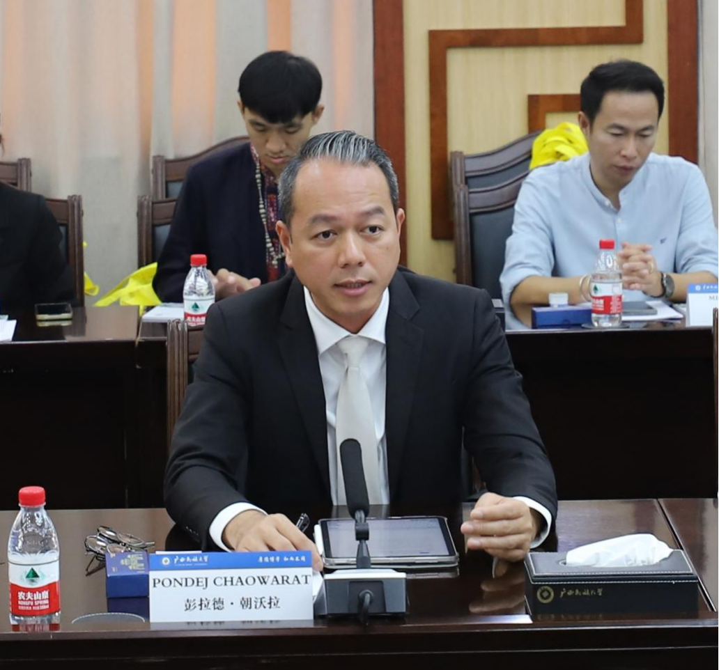 彭拉得·朝沃拉介绍了泰国玛哈沙拉坎大学的基本情况及发展历程。他表示,中泰友谊源远流长,双方有着共同文化根基。玛哈沙拉坎大学与广西民族大学一直保持着良好的交流与合作关系,希望双方能够在民族文化传承、非遗文化遗产保护、乡村振兴等多个领域展开深入合作研究,促进学术交流与知识共享,共同推动中泰民族文化学术研究的进步与发展。