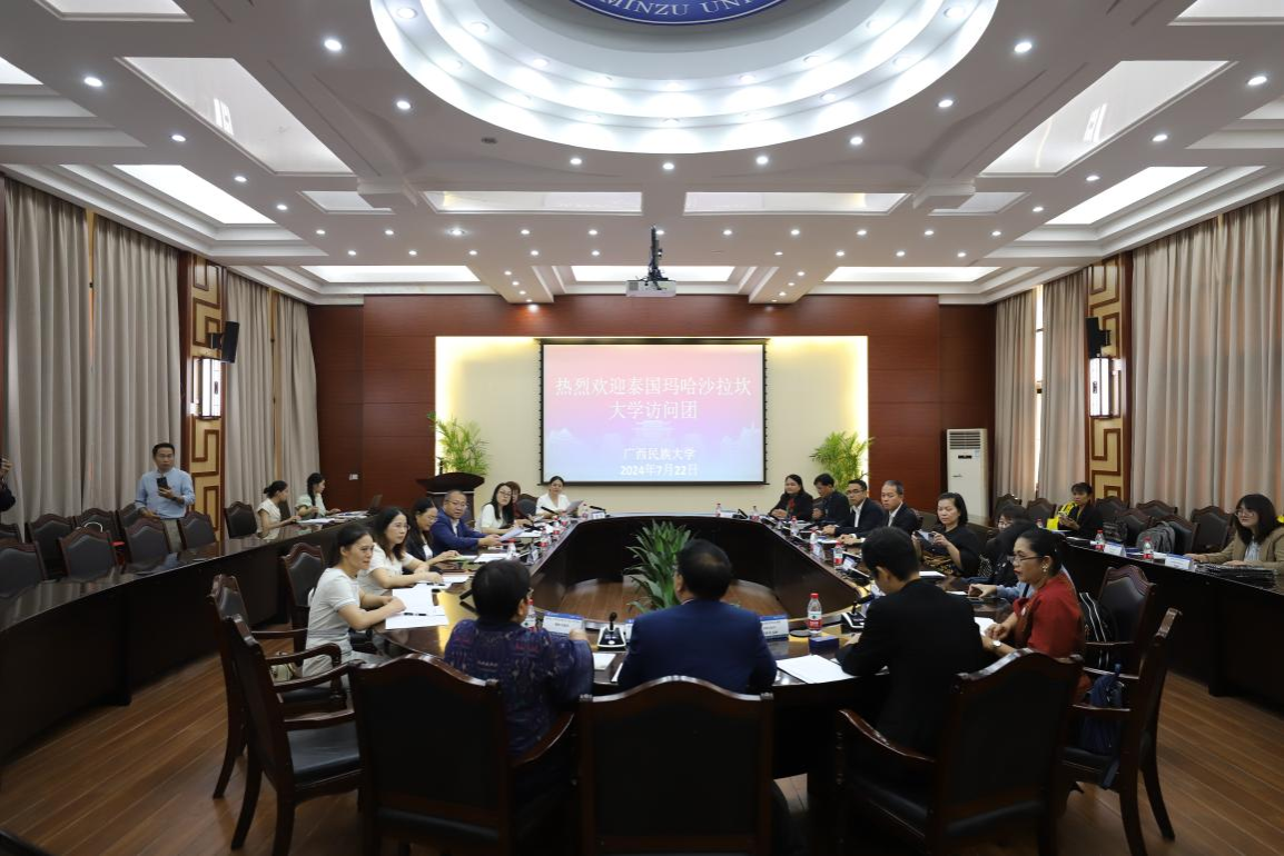 7月22日上午,泰国玛哈沙拉坎大学副校长彭拉得·朝沃拉一行15人莅临我校进行访问交流,开展中泰民族语言文化研究合作交流研讨会,会议由必威西汉姆联党委书记、广西民族文化保护与传承研究中心主任陆晓芹教授主持。广西民族大学副校长姜明国教授、国际教育学院院长周艳鲜教授,以及必威西汉姆联教师、广西高校人文社科重点研究基地“广西民族文化保护与传承研究中心”研究人员黄玲、吴满香、罗红流、韦佳蓓等接待来访嘉宾并参加会议。
