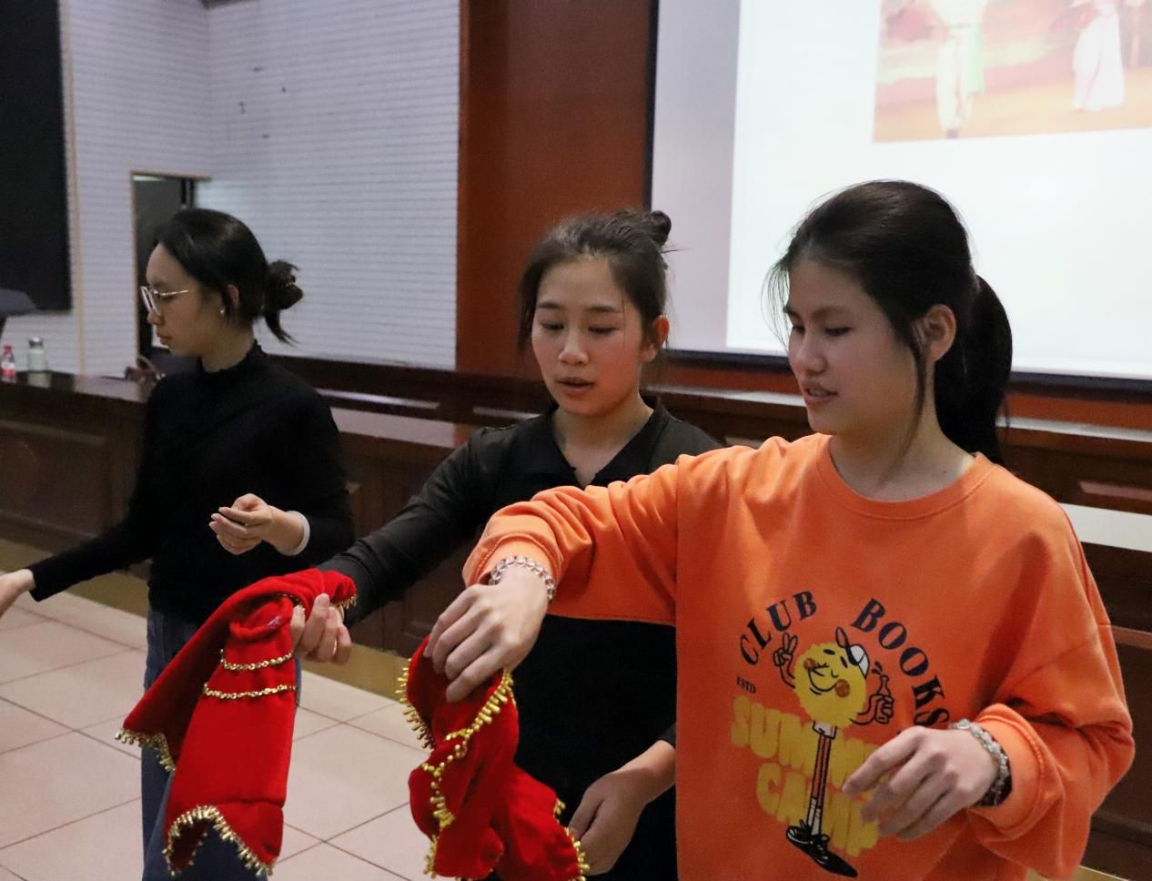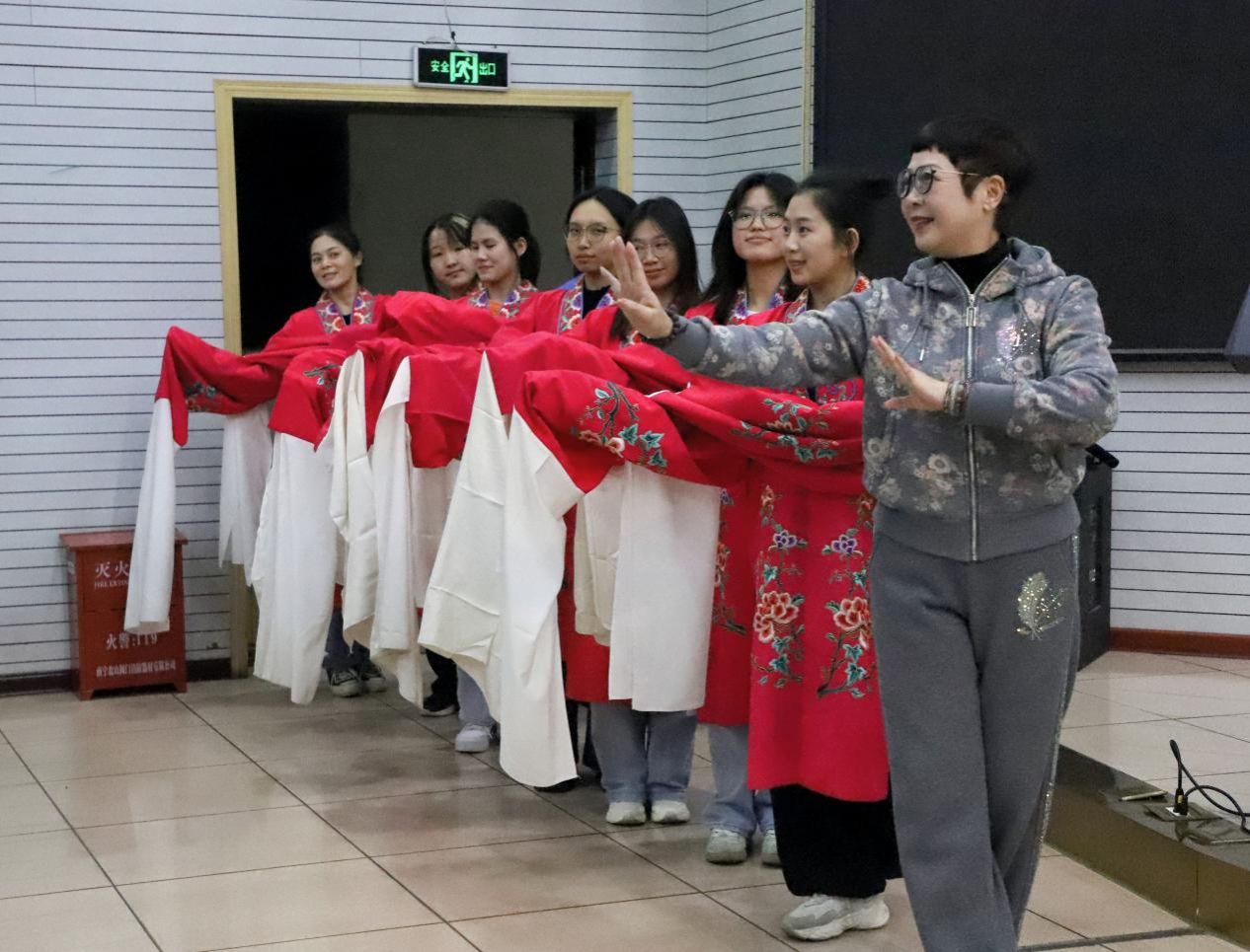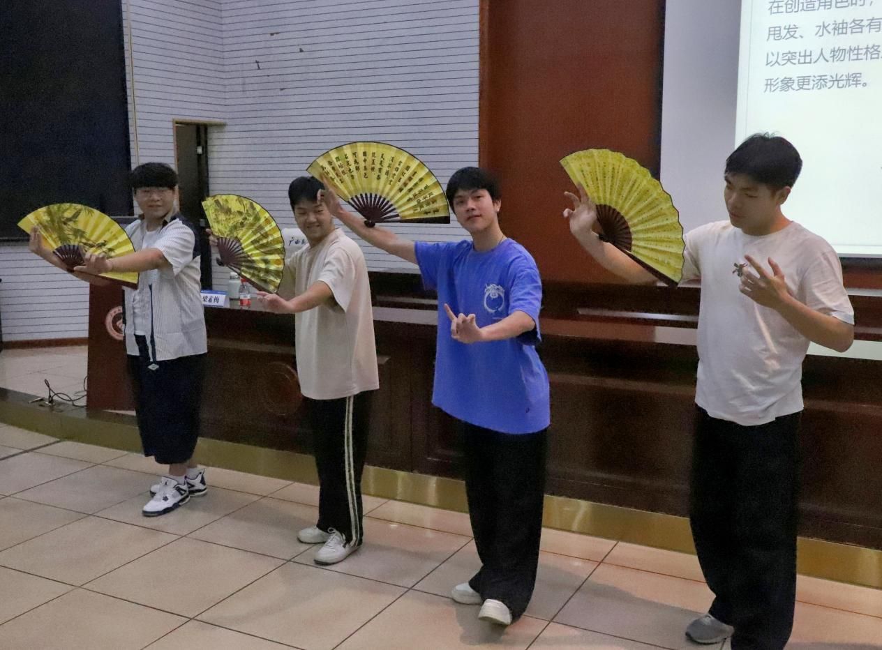 在现场互动环节,梁素梅老师携助教杨飞鹏、马双颖开展沉浸式教学。花枪、大刀、水袖、折扇等戏曲道具轮番登场,助教团队通过“勾、挑、冲、扬”等十余种技法,展现戏曲身段组合,诠释“无动不舞”的舞台美学。她邀请学生观众登台学习水袖抛接、折扇开合等技法,并依次校正动作角度。近20名体验者在助教带领下分组操练,通过青年学子的深度参与,让传统艺术可触可感,为非遗传播注入活力。